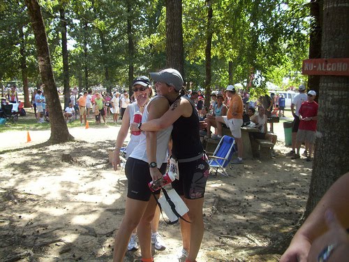 The bike course was good, but WAY hillier than I imagined! It was almost like riding in Kentucky! I was glad that I had trained on hills. The worst thing about the bike was that everyone was drafting and some people were riding 2 and 3 deep, across the road. There were 4 girls wearing LSU triathlon jerseys that were riding three across - that made me so mad! People were swerving into the oncoming traffic lane in order to pass them, and even then they would not drop back. I yelled out that they were going to kill someone riding like that, and they finally got over. I later saw a USAT official on a motorcycle taking down their numbers, so at least justice was served! I ate one gel on the bike and drank one full bottle of Gatorade/water mix, and about half of my second water bottle - it was pretty hot out there!